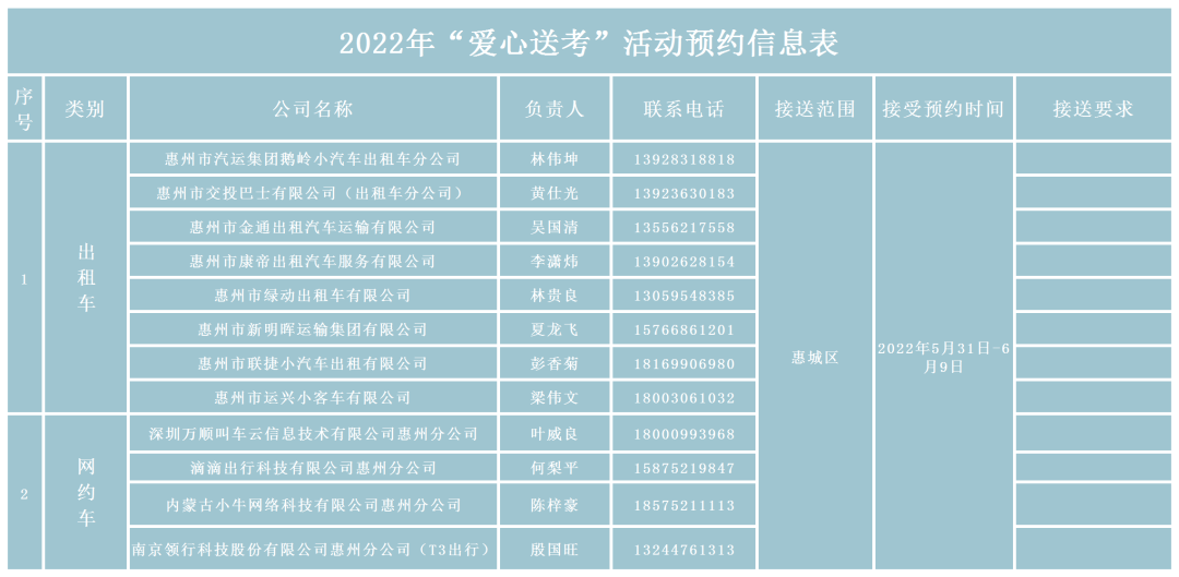 在惠州6月7日至9日高考期间,除公交外,出租车、网约车也参与爱心送考,考生可凭准考证免费乘坐全部公交车和系有爱心绿丝带或挡风玻璃贴有“爱心送考”标志的出租车、网约车。