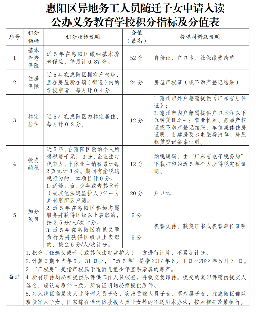 注:异地务工人员随迁子女积分计算日期为2017年6月1日~2022年5月31日。