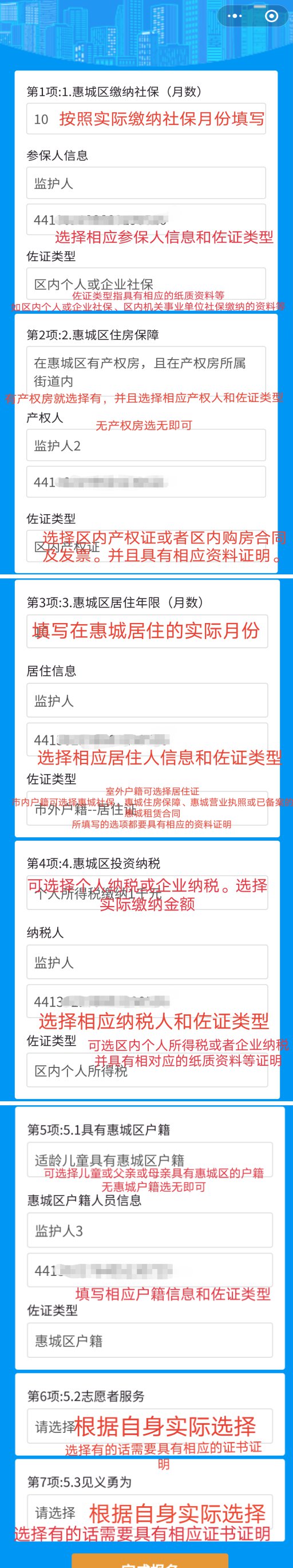 根据已有的证明资料填写相应的积分选项,全部选项填写完成并且检查无误后,点击最下方完成报名。
