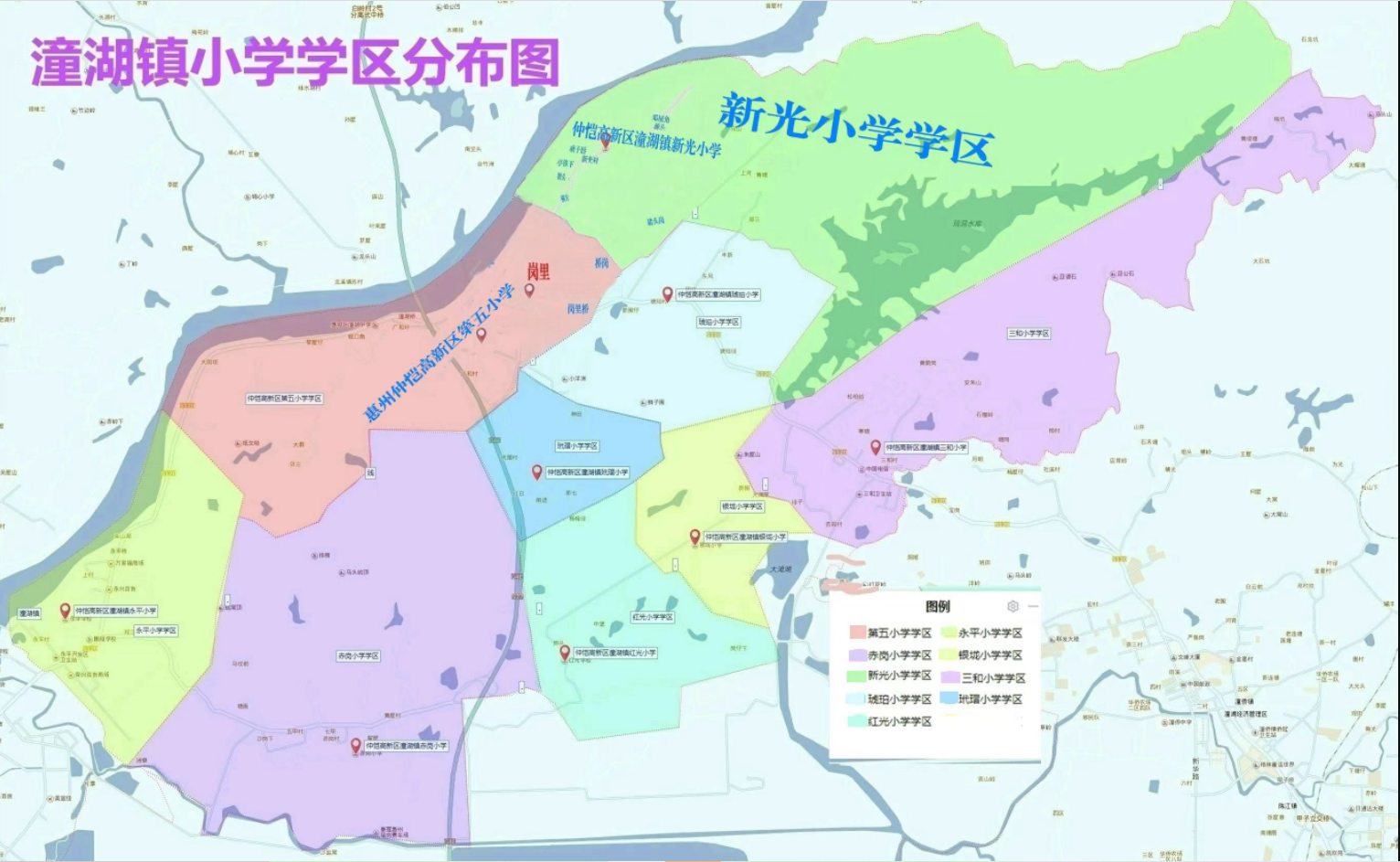 注意:潼湖镇学区调整,潼湖镇岗里小学并入仲恺第五小学,辖区内的学生调剂到第五小学就读;潼湖镇北坝小学并入潼湖镇新光小学,辖区内的学生调剂到新光小学就读。