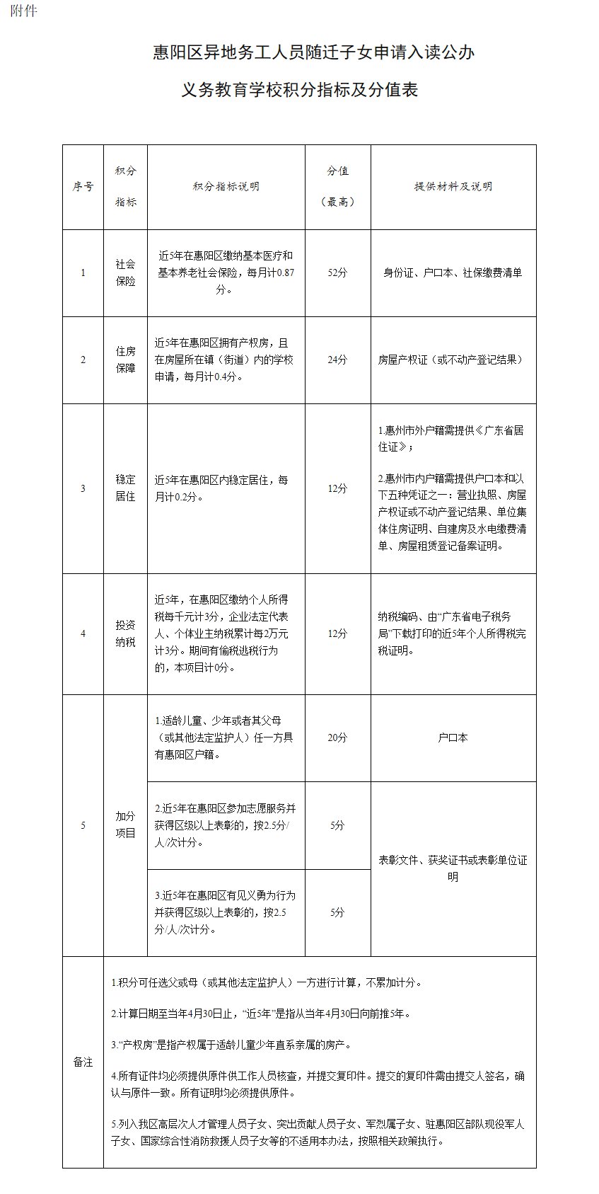 惠阳区异地务工人员随迁子女申请入读公办义务教育学校积分入学积分算法