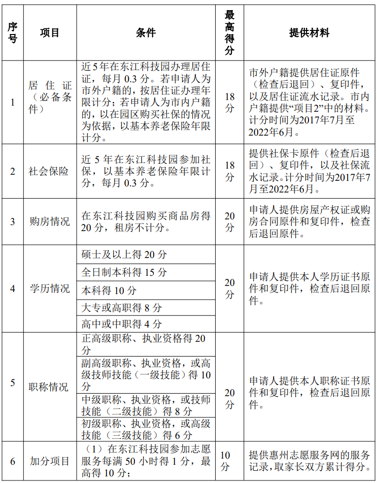 (1)父母(监护人)一方在园区企业工作,6月24日前签订劳动合同并在园区购买社保满3个月;若申请人所在企业为新搬迁至园区或新投产企业,申请人因工作需要从原厂区安排在东江科技园厂区工作且与原企业签订劳动合同并购买社保满3个月,在6月24日前将劳动关系和社保转至东江科技园的,在企业原驻地购买的社保按照80%计算积分,并提供原驻地社保缴纳清单;