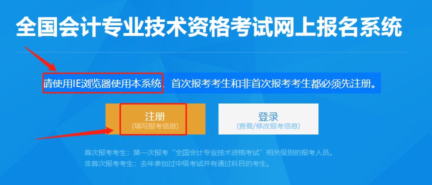 1、进入报名入口,然后点击“注册”(注意,要使用IE浏览器(一般指Windows系统自带的那个浏览器)使用报名系统)