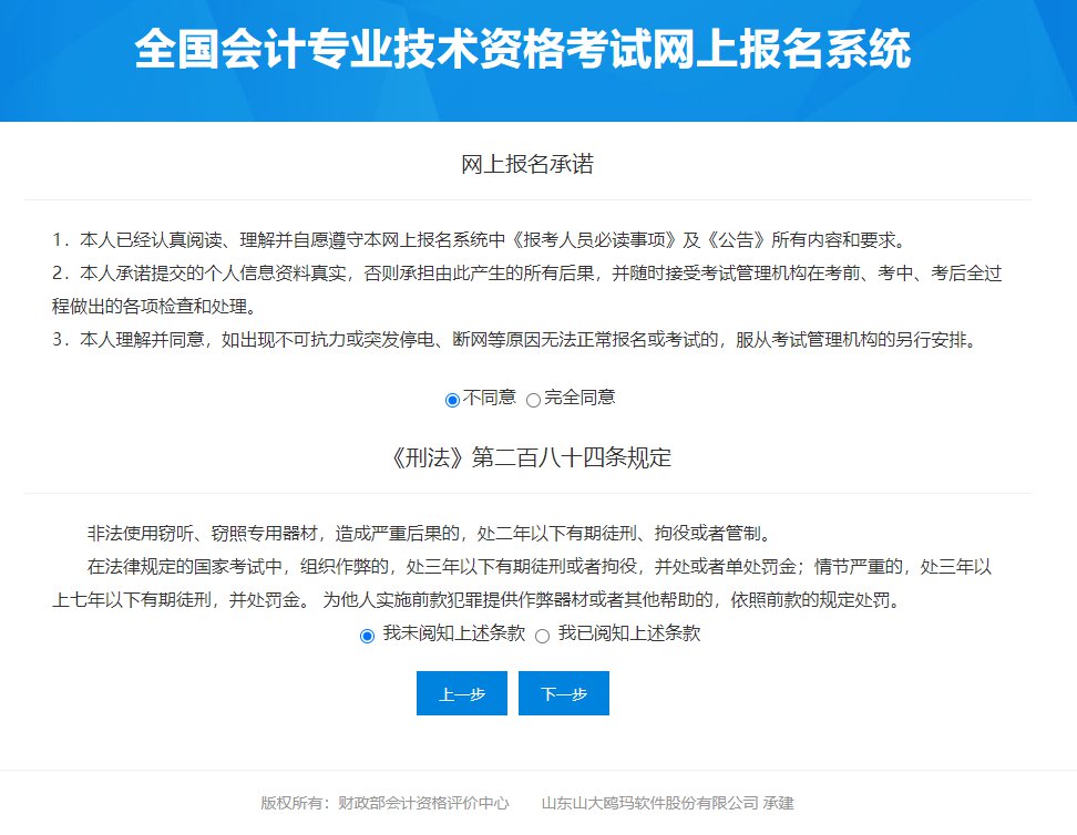 2、然后查看“网上报名承诺”,选择“同意”以及“已阅读”,然后点击下一步