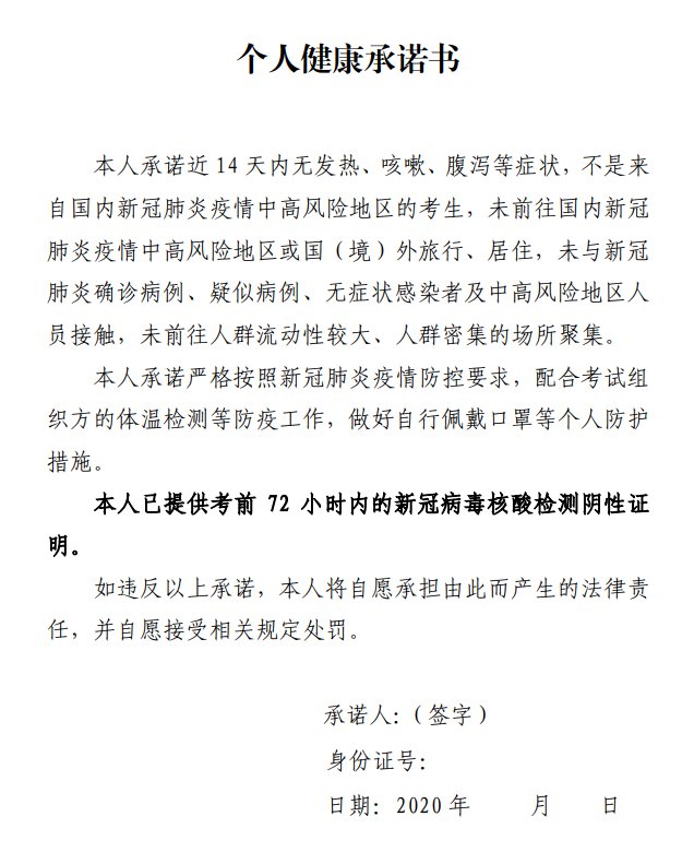 1. 参加考试的所有考生需提供考前72小时内新冠病毒核酸检测阴性证明及本人签署的最新版个人健康承诺书