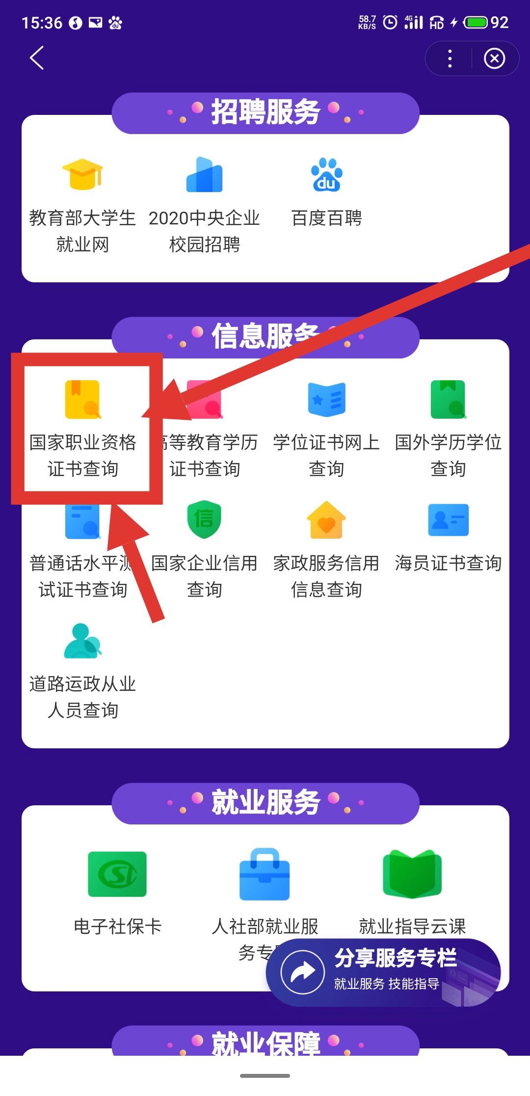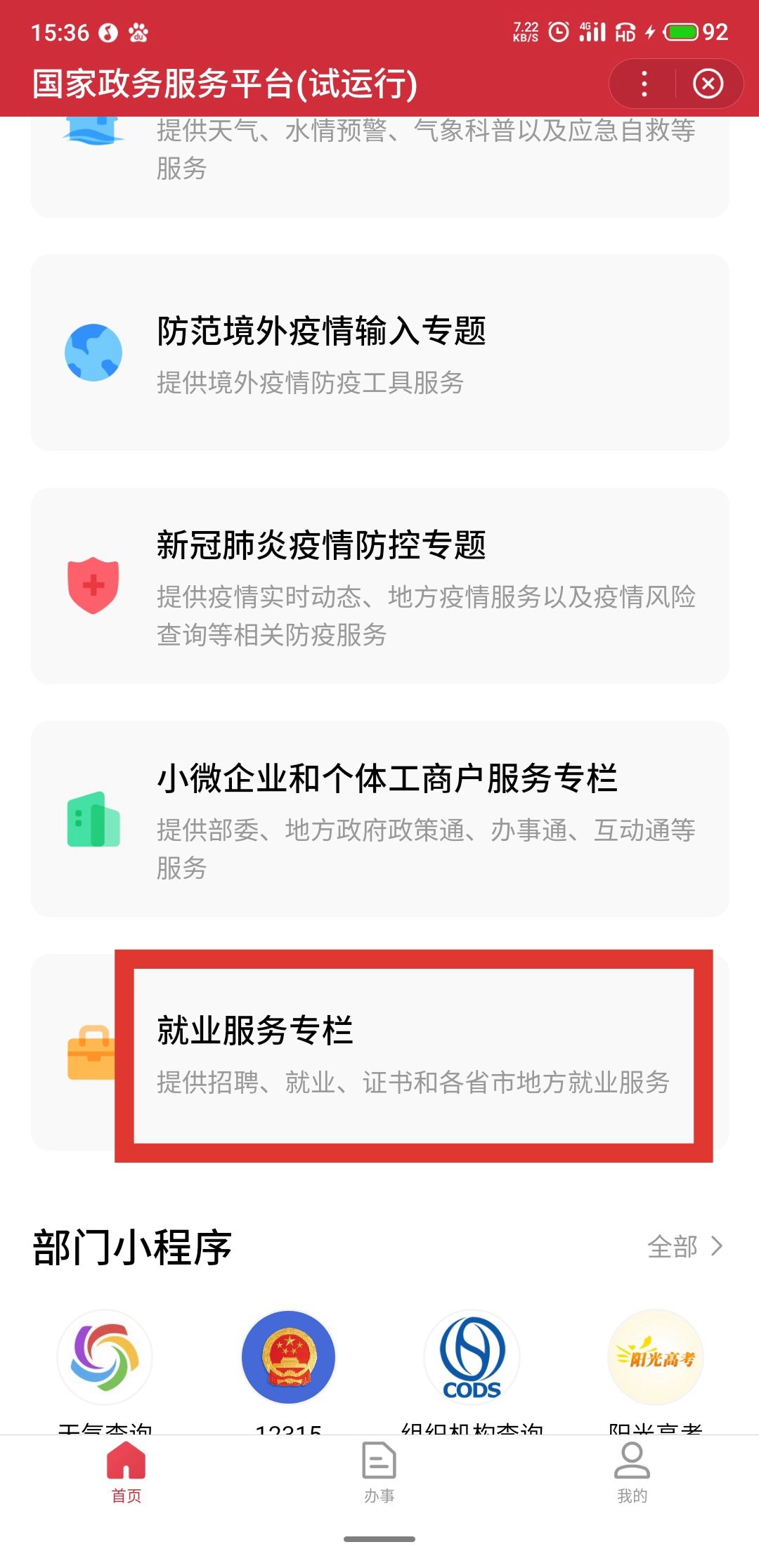 第一步:打开百度APP。搜索“国家政务服务平台”,点击进入小程序,然后选择“就业服务专栏”