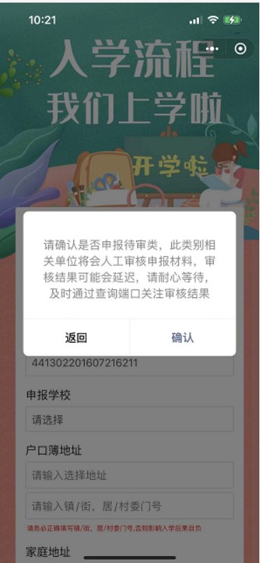 五、报名系统户籍数据是相关部门根据前期幼儿园采集的摸底数据核实返回,如果报名系统无法匹配到学生的户籍信息,请确认孩子姓名及身份证号是否输入有误,如果信息输入有误则点击“返回”进行更正;如果信息输入无误则点击“申报待审”,再次确认后,系统会返回主界面,重新选择“申报类型”后逐项如实、准确的填报相关信息并上传佐证材料