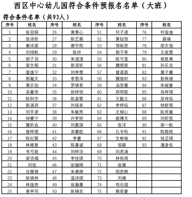 根据《2021年大亚湾区公办幼儿园招生工作方案》和《大亚湾西区中心幼儿园2021年秋季招生方案》,大亚湾西区幼儿园于2021年6月25日至28日进行新生预报名登记,经相关部门审核,符合优待条件幼儿6人,符合预报名条件幼儿645人。现将名单进行公示,公示期为2021年7月8日至14日,公示期内如有异议,可实名反映,投诉电话:5191520(幼儿园)、5562161(区宣教局)