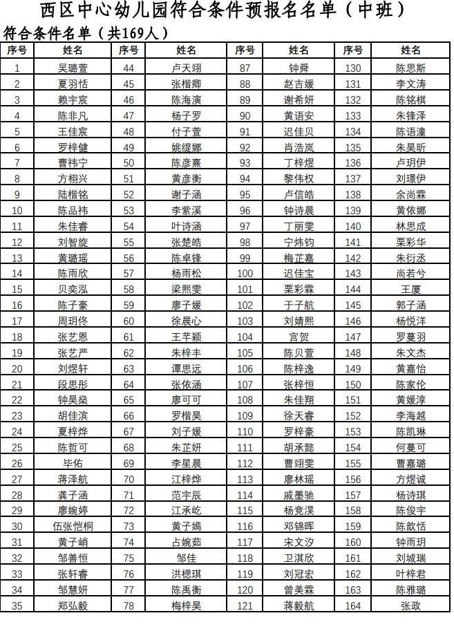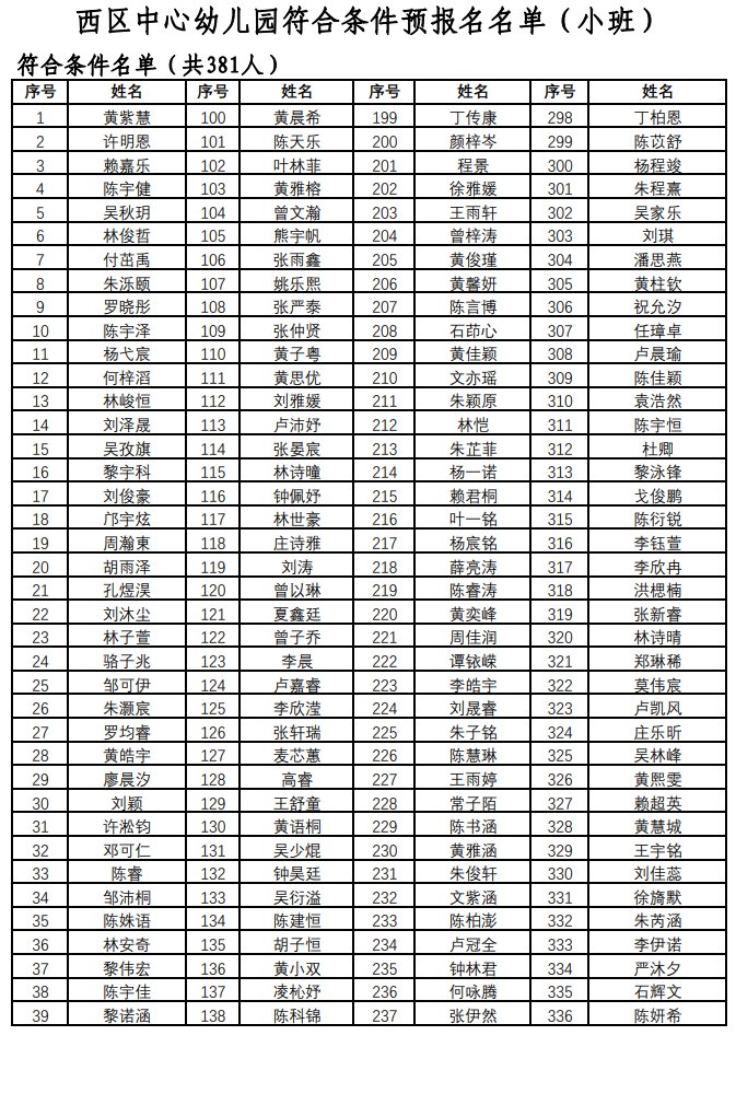2021西区中心幼儿园秋季招生预报名名单公示