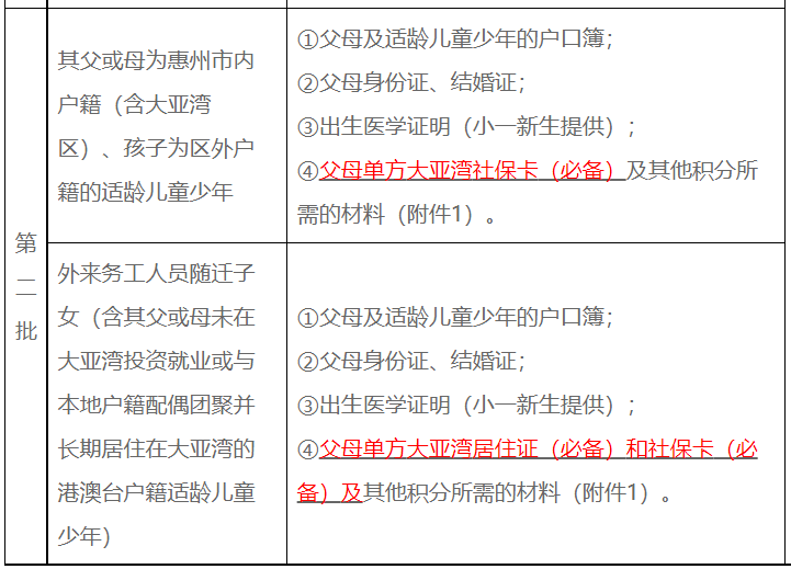 第二批:非大亚湾区户籍适龄儿童少年。非大亚湾区户籍适龄儿童少年通过积分入学办法(见附件1)申请学位。