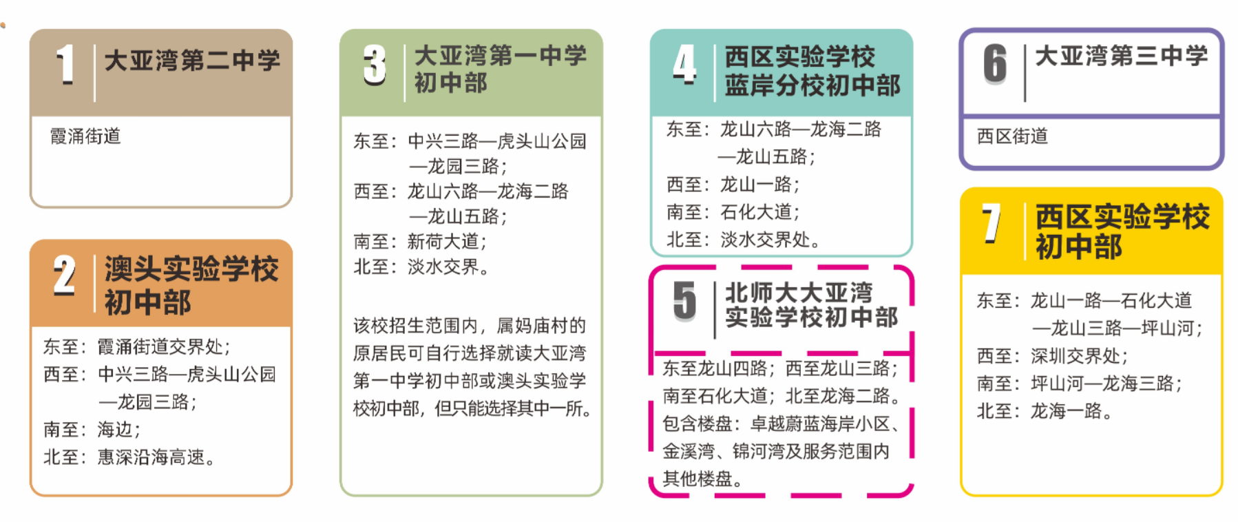 根据相对就近入学原则,将隶属澳头街道靠近大亚湾第一中学初中部(位于西区龙山八路)的区域(部分澳头中心区及部分妈庙村)划入大亚湾第一中学初中部招生范围。其中,大亚湾第一中学初中部招生范围内,属妈庙村的原居民可自行选择就读大亚湾第一中学初中部或澳头实验学校初中部,但只能选择其中一所。