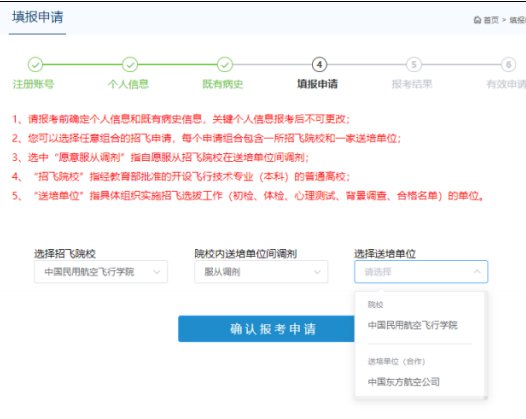 完成以上操作,点击【填报申请】菜单,考生可以填报招飞申请组合。考生须根据提示,谨慎选择个人要报考的招飞申请。首先选择报考的“招飞院校”,然后选择是否服从“院校内送培单位间调剂”,再选择“送培单位”,最后点击【确认报考申请】即可完成。