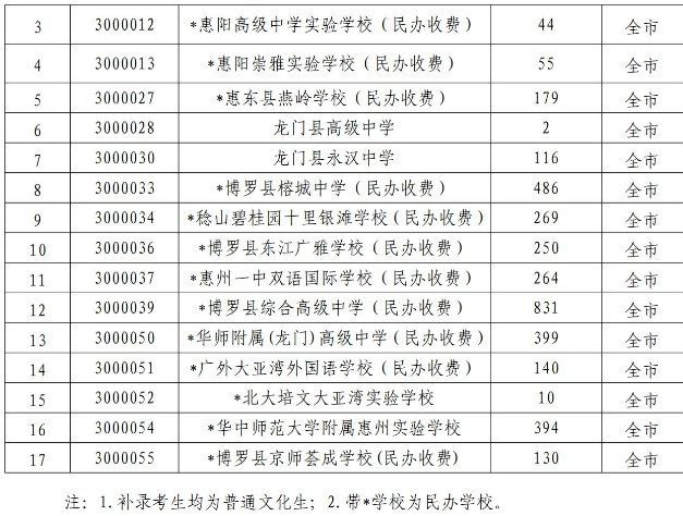 2021年惠州中考普通高中补录人数计划+学校名单