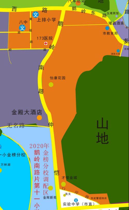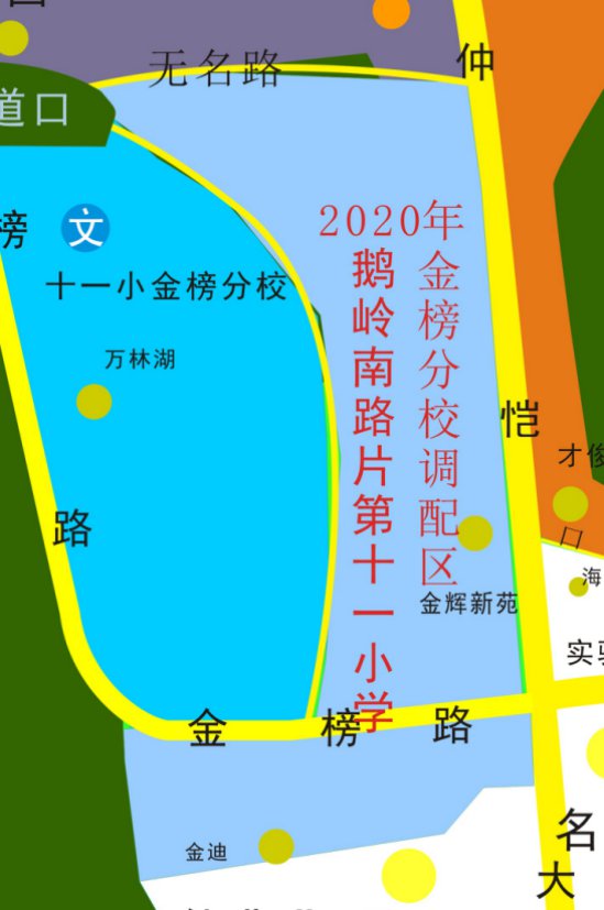 2020年鹅岭南路片第十一小学金榜分校调配区:仲恺大道8号(不含金殿大酒店)以南----鹅岭南路110号(含金迪小区),以上路线和山地所包围的区域(不含2018年后入住的楼盘)。