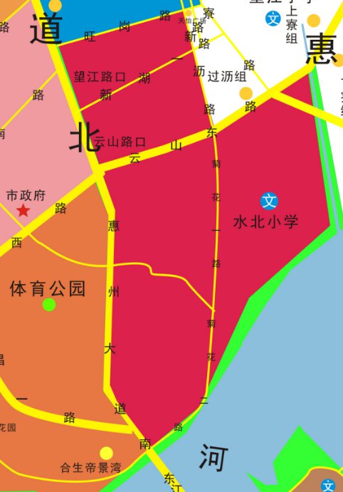 水北小学:惠州大道东接旺岗路至新沥路以南,接云山东路以西,接新寮南路至菊香三路以西,接菊香二路至期湖塘路,接菊花二路至惠州大道,以上所包围的区域(包括伟豪领域、天泽名居、丽景花园、璟都、水北新村三期)。