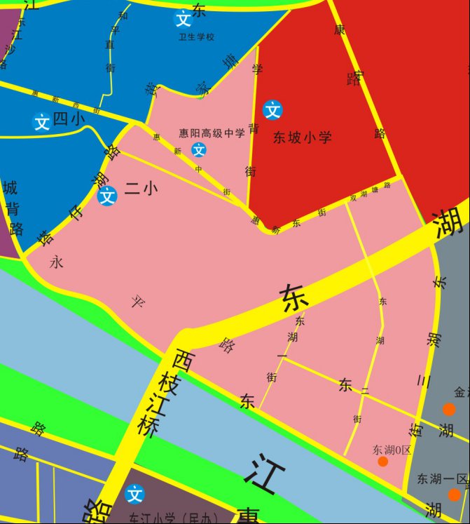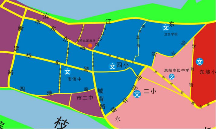 东坡小学:滨江东路——黄家塘路——学背街——惠新东街——双湖塘路,经东湖西路接东平大道——东江大桥桥头,以上路线所包围的区域。