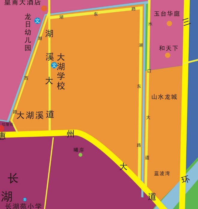 大湖学校:大湖溪与龙津交界处的水沟以南,水口大道的山水龙城往东接三环东路以西,惠州大道以北,以上路线所包围的区域。
