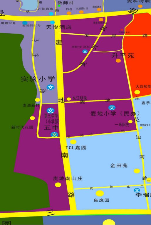 第五中学(小学部):自第五中学(小学部)沿麦地南路至三环路与山地所包围的区域;麦地南路——麦地路——花边南路——麦地东一路——麦地南路,以上路线所包围的区域。