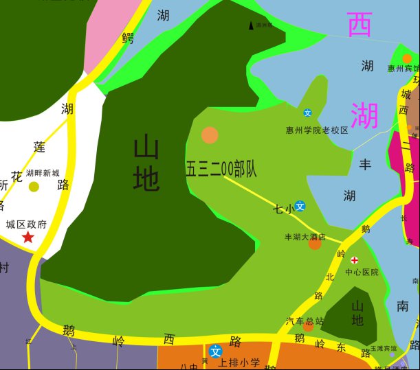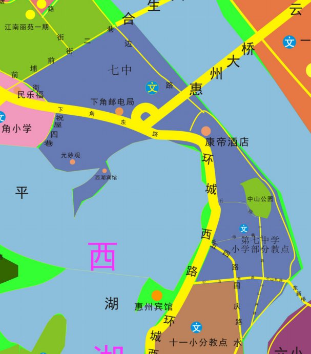 第七小学:鹅岭西路接鹅岭东路至原玉滩宾馆以北,至丰湖和南湖边(含惠州学院老校区)。