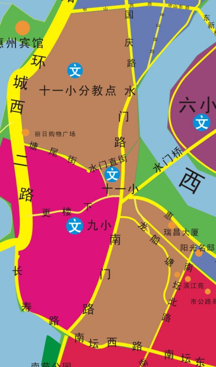 第十一小学:中山西路——国庆路——水门路——水门直街——塘尾街——环城西二路,以上路线所包围的区域。水门直街接水门路接更楼下路所包围区域;南门路——南坛西路——南坛北路——惠沙堤一路所包围的区域。
