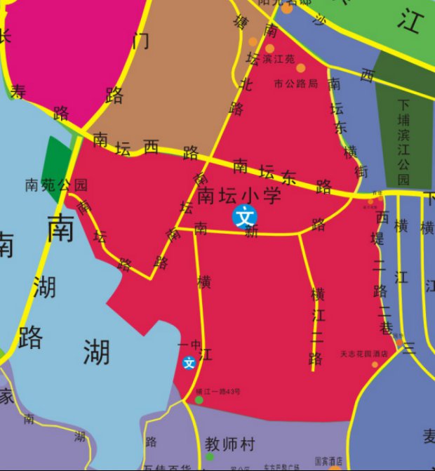南坛小学:南湖路——南坛西路——南坛北路——西堤路——南坛东横街——西堤二路二巷,从军分区旧住宅区(不含巴黎广场等)后面至市一中后门,以上路线所包围的区域。