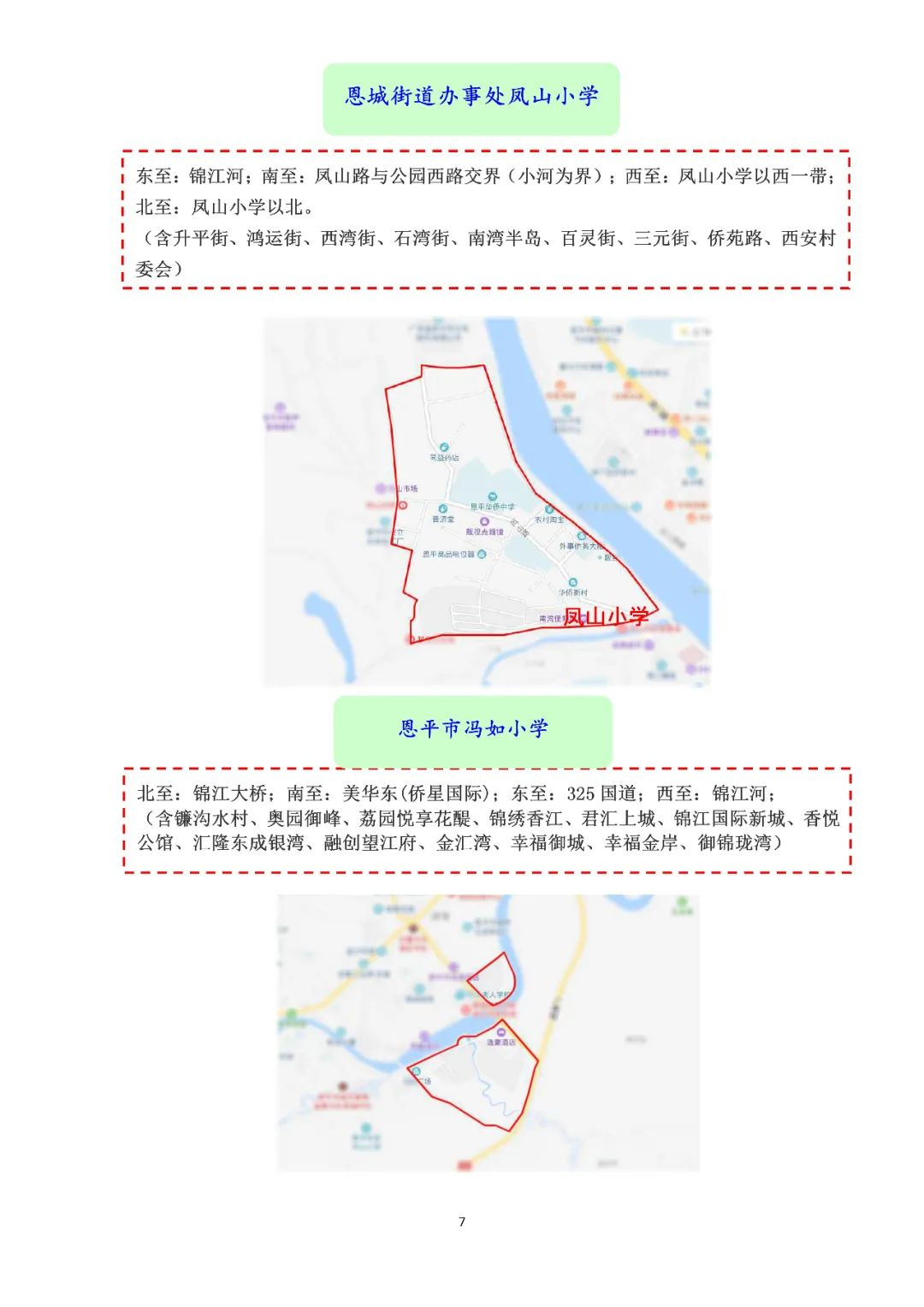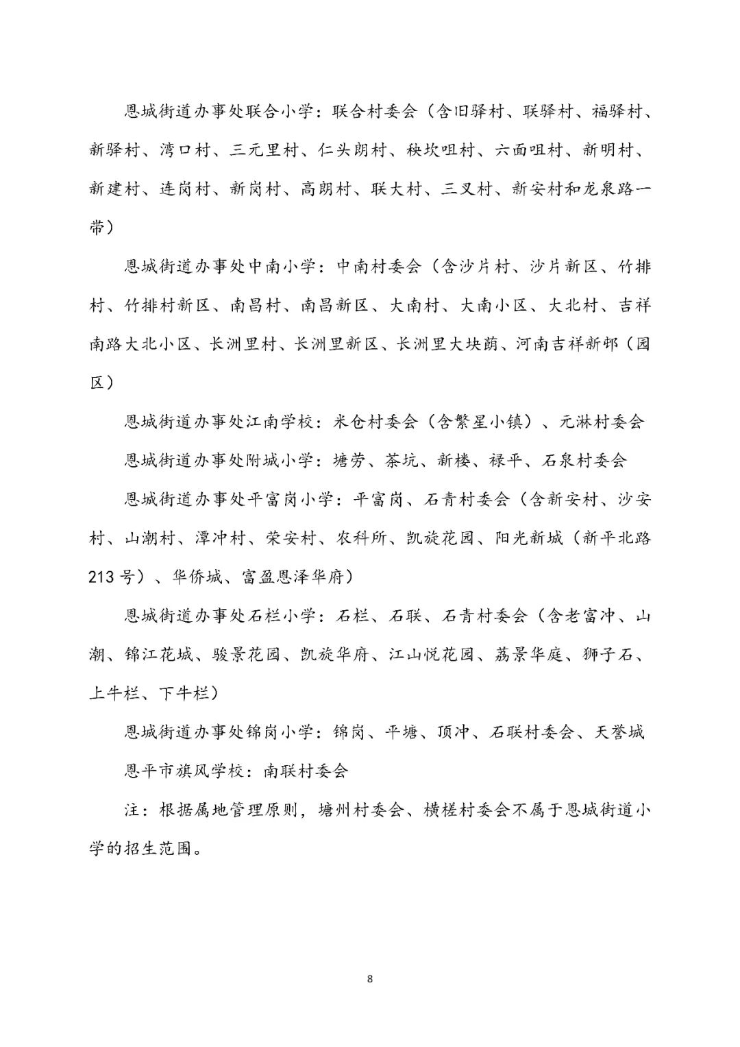 (二)恩城城郊小学:恩城街道办事处附城小学、恩城街道办事处平富岗小学、恩城街道办事处联合小学、恩城街道办事处中南小学、恩城街道办事处石栏小学、恩平市江南学校、恩城街道办事处锦岗小学。