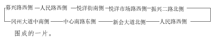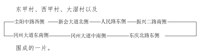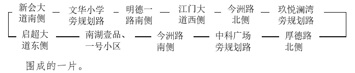梅江村以及新会大道南侧、三和大道东侧、今洲路北侧、启超大道西侧的区域(耀荷新村、新会大道中单号、耀兴花园、雅景花园、碧华园等)。