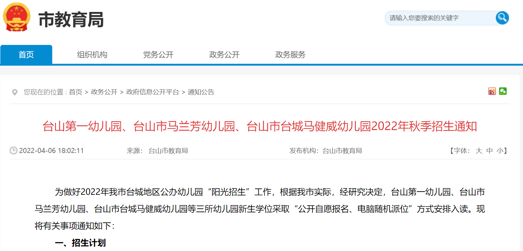 台山台城地区公办幼儿园2022年秋季招生通知
