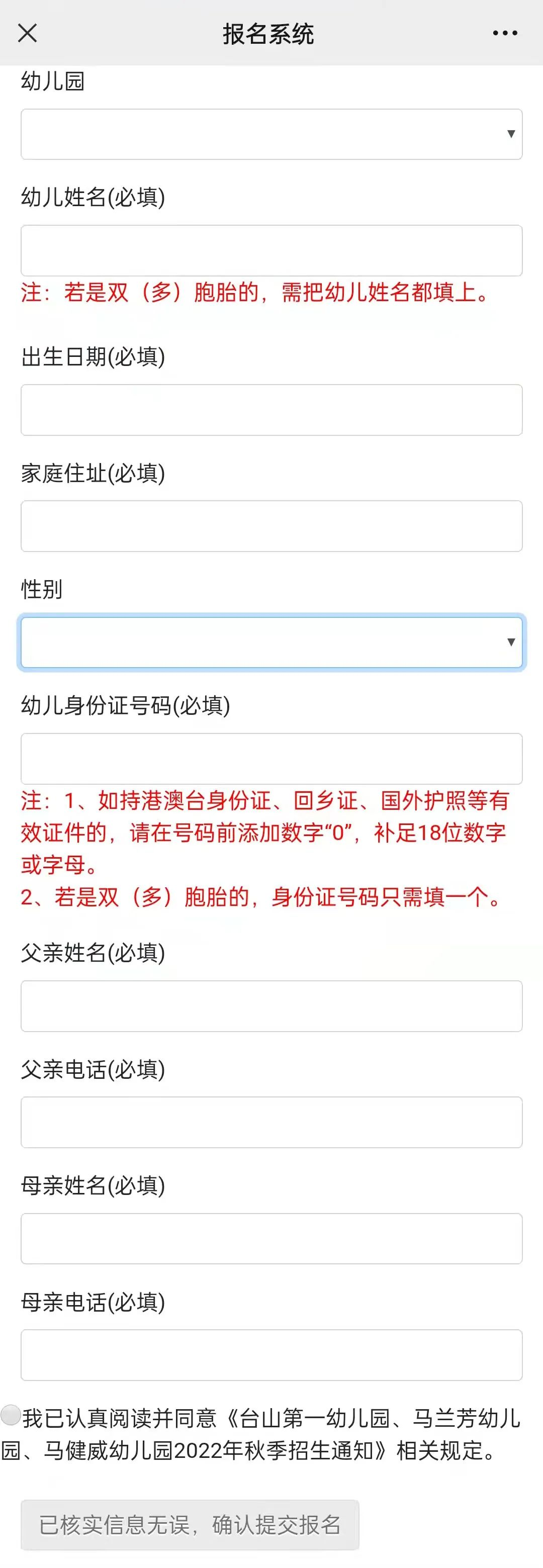 2.报名不分先后,如果报名人数在幼儿园招生名额范围内的,直接安排入读;如果报名人数超过幼儿园招生名额范围的,进行电脑随机派位。报名幼儿是双胞胎或多胞胎的,需在“幼儿姓名”一栏把幼儿姓名都填上,“性别”一栏选“双(多)胞胎”,共用一个号码,若获得派位则相应名额在幼儿园原招生计划基础上增加。