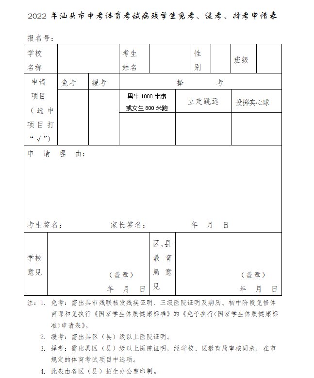 身体发育异常、严重营养不良及肥胖症、畸形等考生应由本人提出申请,按上述要求提交相应证明材料。并填写《申请表》。学校应于2月20日前加具意见后,报区(县)教育局审核批准。