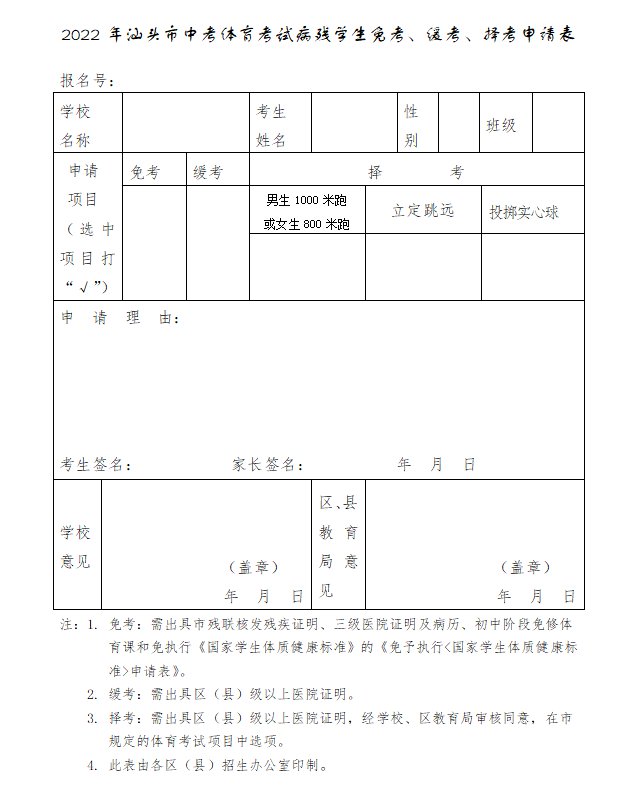 《汕头市中考体育考试病残学生免试、缓考、择考申请表》:点击下载