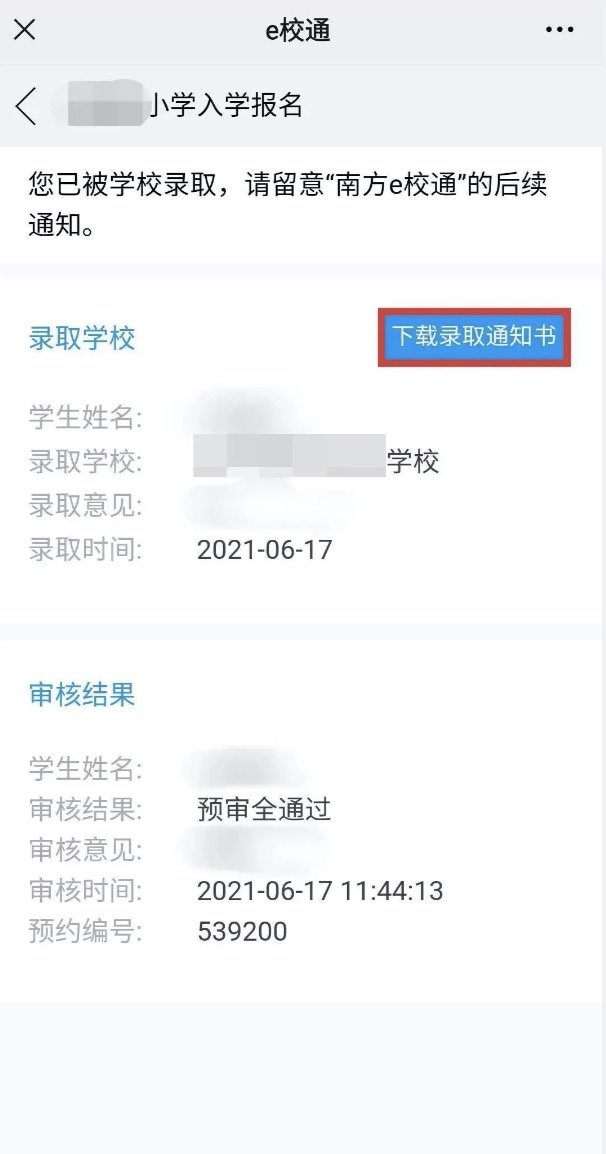 招生录取结果将陆续通过【南方e校通】推送给家长,家长收到通知后,点击消息详情进行查看。