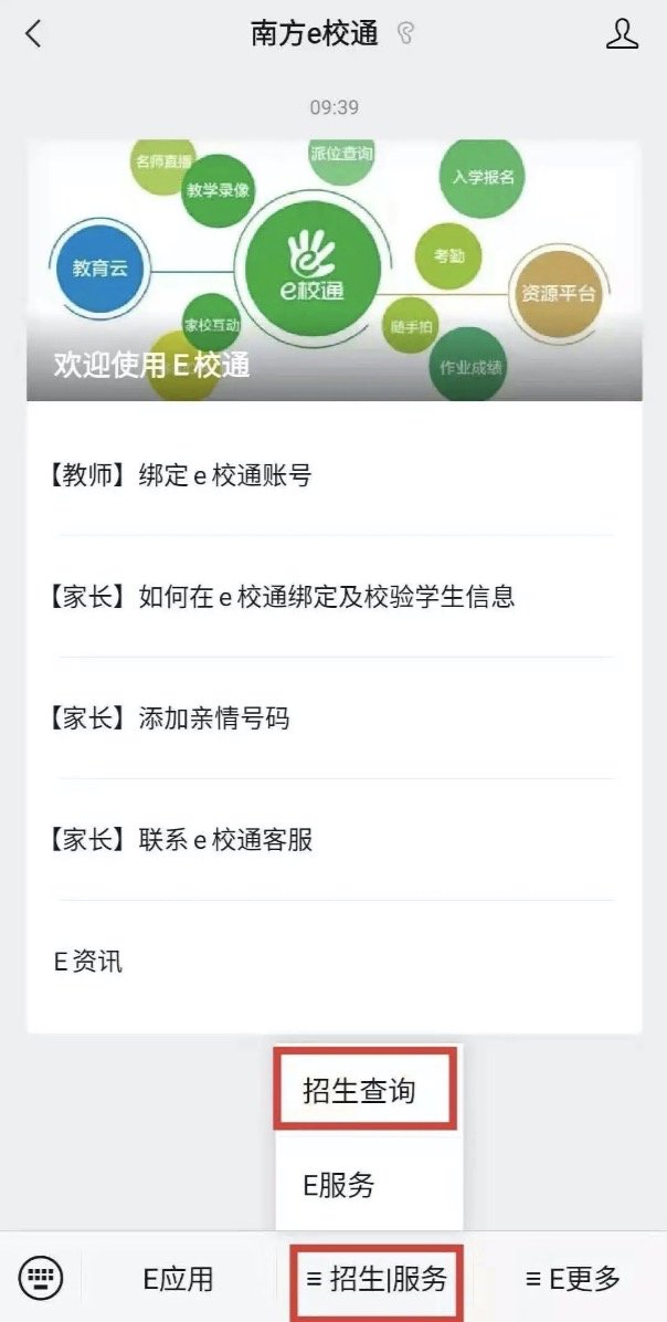 在【南方e校通】公众号点击【招生|服务】-【招生查询】,输入学生身份证/学籍号码及姓名,点击【查询】。