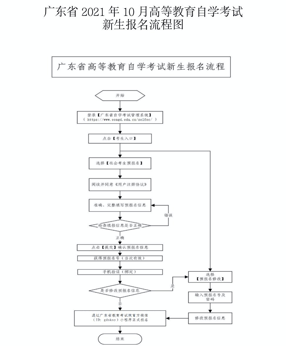 1.预报名。新生在规定的时间内自行登录广东省自学考试管理系统(https://www.eeagd.edu.cn/selfec/,下同), 从【考生入口】通道进行预报名。根据《关于广东省高等教育自学考试专业调整有关事项的通知》(粤考委﹝2018﹞1号)规定,新生报名只能选择调整后的专业名称。预报名时考生须录入个人信息并设置个人密码,预报名成功后将获得一个预报名号,预报名号仅当次有效。考生预报名成功后还须完成本人手机绑定方能进行正式报名。