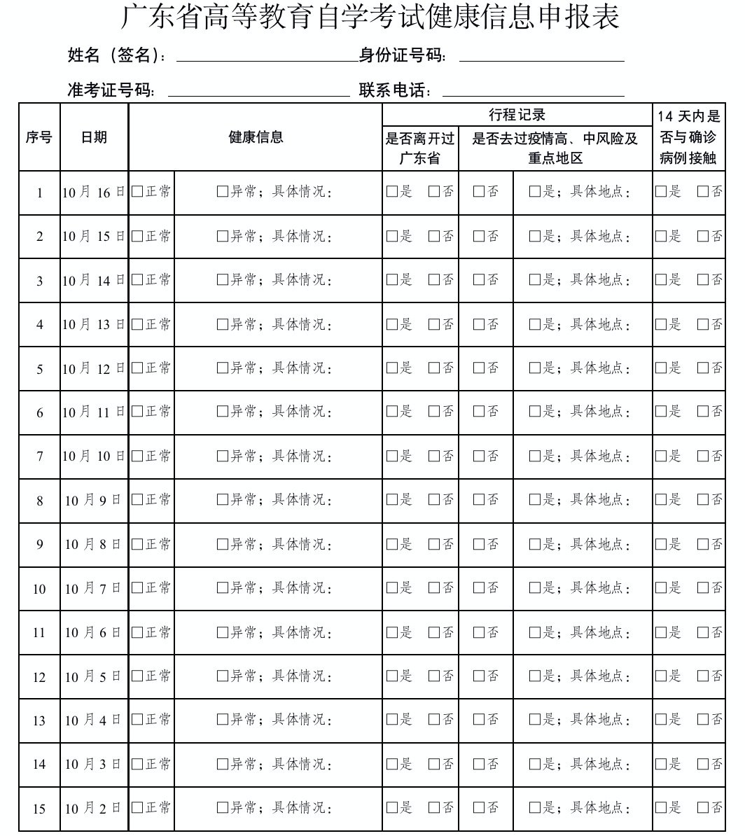 2021年10月广东省高等教育自学考试健康信息申报表下载入口