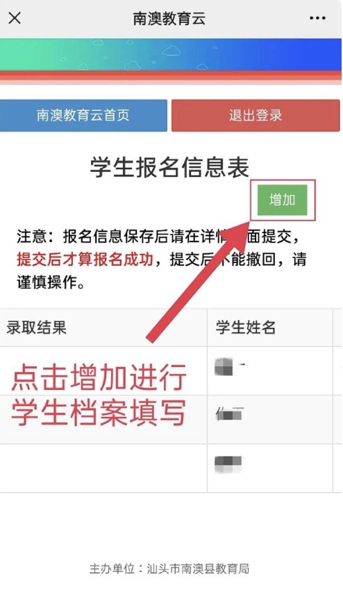 登陆成功后,点击【增加】进入学生报名页面进行报读填报信息。