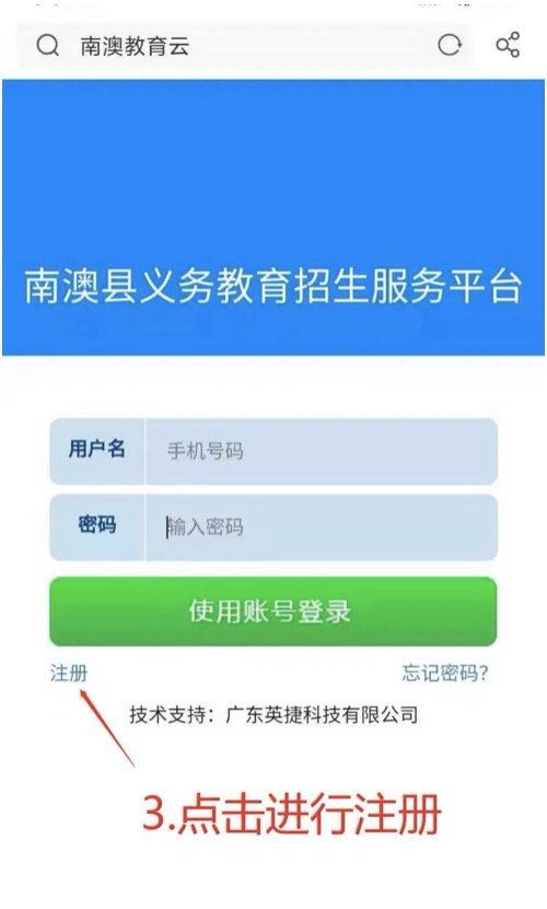 在“南澳县义务教育招生服务平台”点击【注册】选项,注册报名账号。