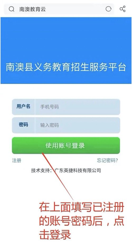 通过手机,用浏览器登录南澳教育云平台,网址:http://www.najy.net,在首页选择“南澳义务教育招生服务平台”,点击进入报名系统。