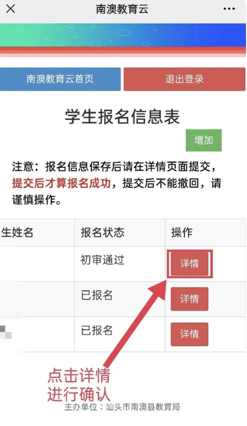 家长可在“学生报读备案表”页面“详情”选项查询报名审核情况,报名初审不通过,将由学校或教育局撤回并通知家长在规定时间内重新填报并提交。