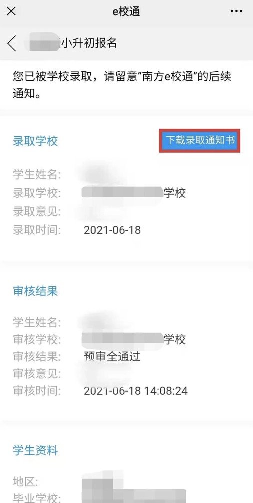 录取结束后,录取结果将通过“南方e校通”推送给您,收到通知后,点击“查看详情”,如图所示: