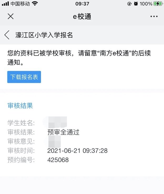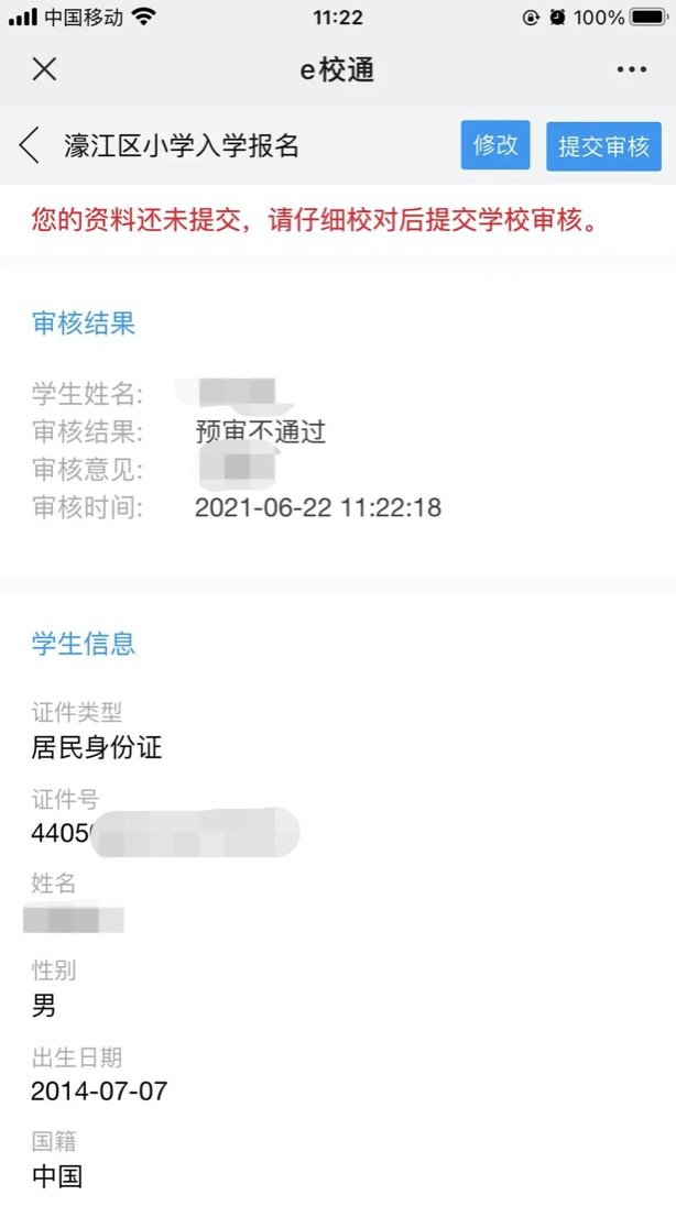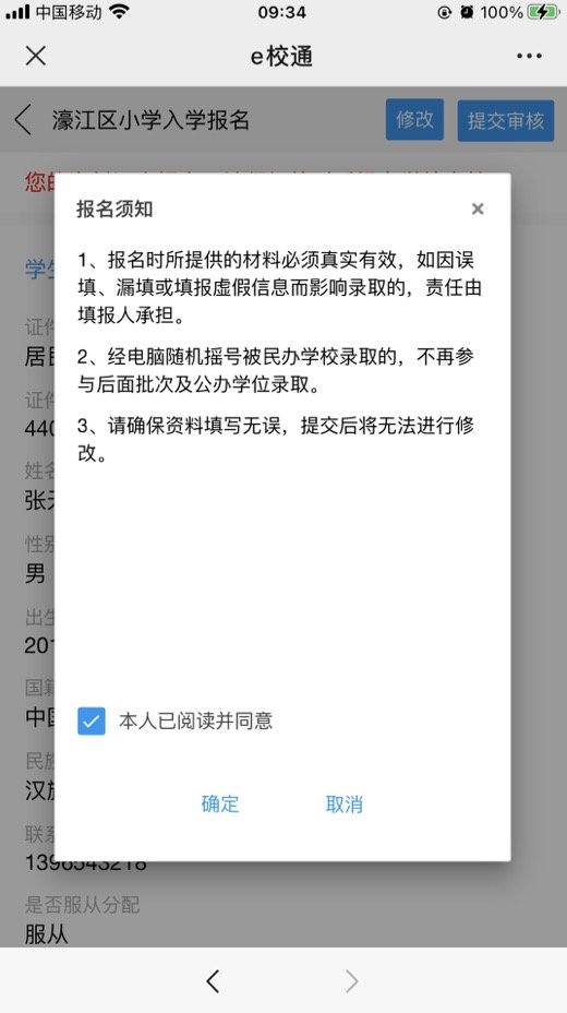 6、上传完成后,点击【提交审核】就可以等待学校的审核通知,注意:提交审核前请仔细阅读《报名须知》,勾选同意后方可提交审核(提交审核后不可再做修改)。提交审核后报名结果将会在规定时间通过“南方e校通”推送给您。