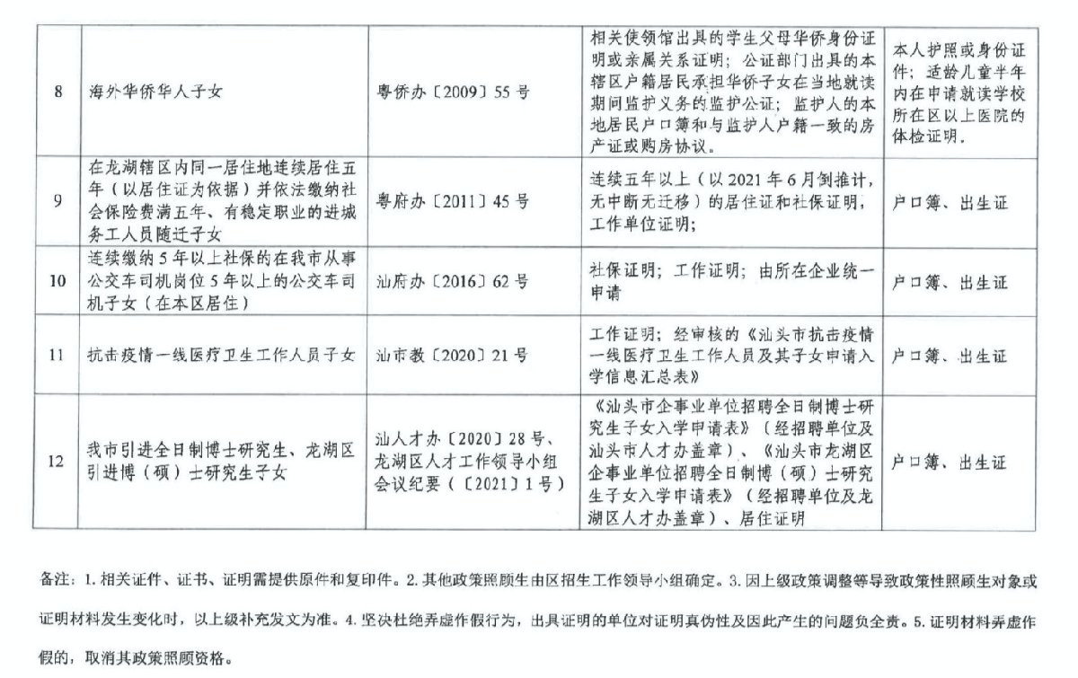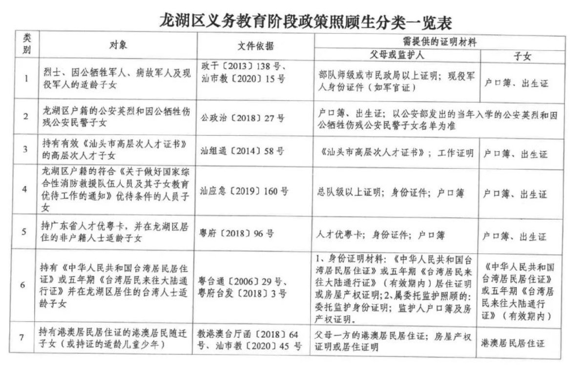 2021汕头龙湖区义务教育阶段政策照顾生分类一览表