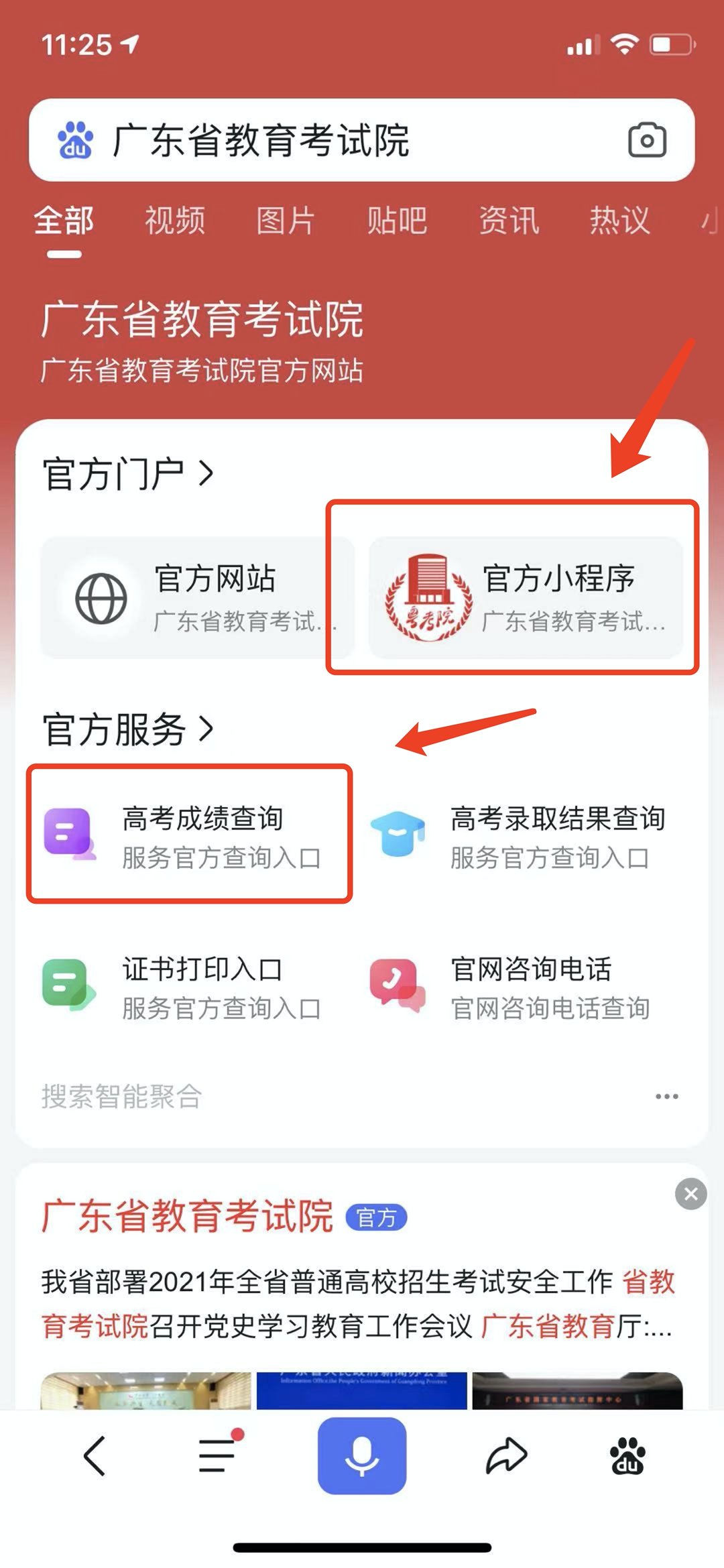 6月25日11:45起,考生在微信搜索并进入“广东招考在线”小程序,点击“成绩查询”,选择考生对应的考试类别,通过考生号和出生日期即可查询考试成绩。也可通过百度App搜索“广东省教育考试院”,打开“广东省教育考试院—智能小程序”进入广东省教育考试院官方发布平台,点击“考试成绩”,输入考生号和密码登录查询成绩。