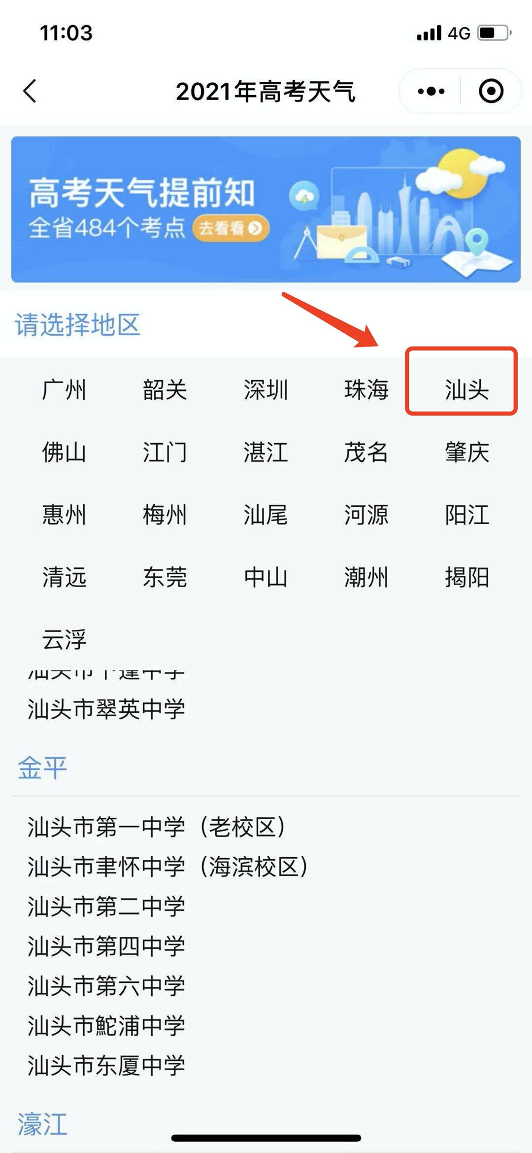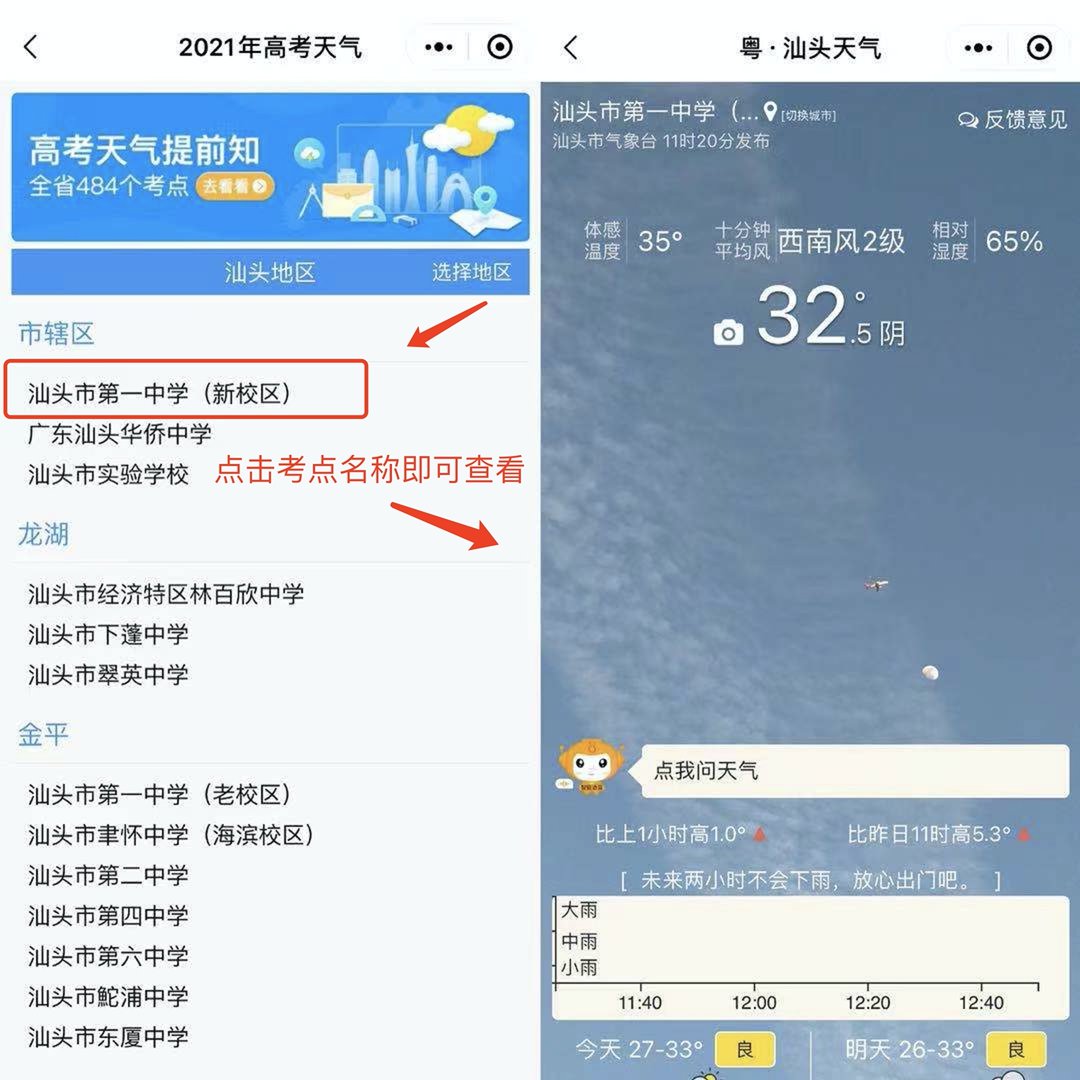 ④在考点名单页面,点击考试所在考场即可查询天气情况。这里以汕头市第一中学(新校区)为例。
