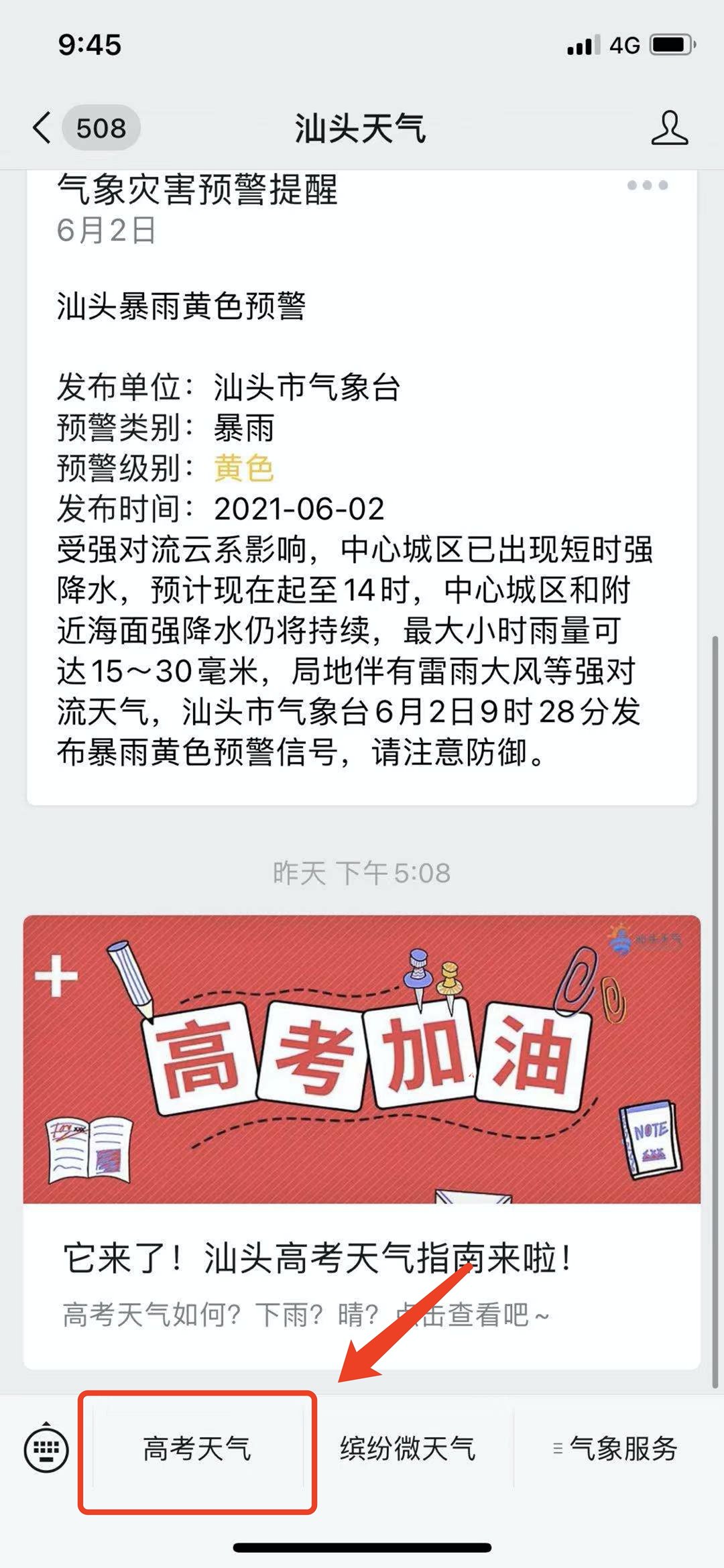 ①进入“汕头天气”微信公众号,点击下方菜单栏【高考天气】。