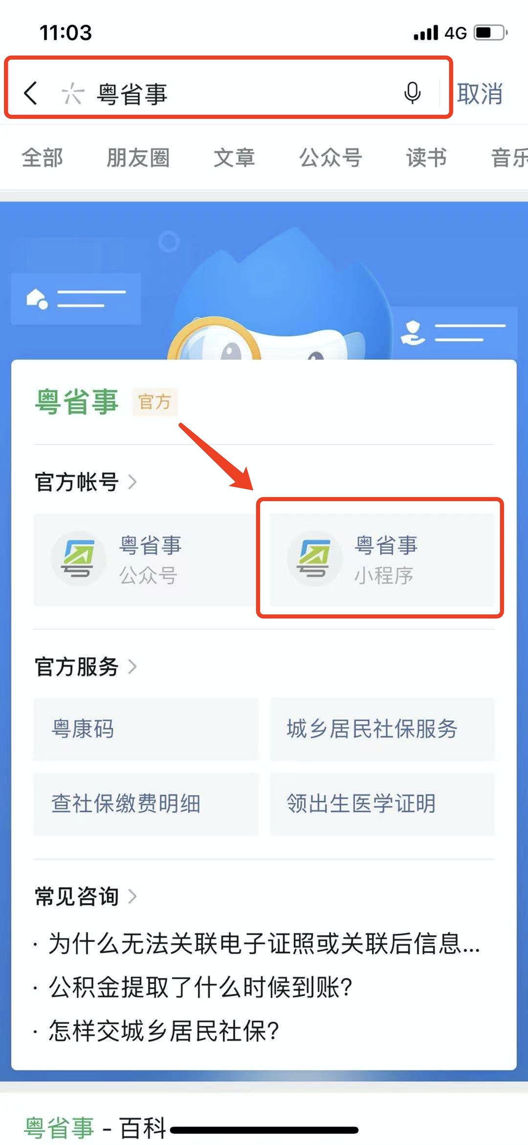 ①进入微信,在搜索框输入“粤省事”,点击“搜一搜 粤省事”。直接也可以进入。