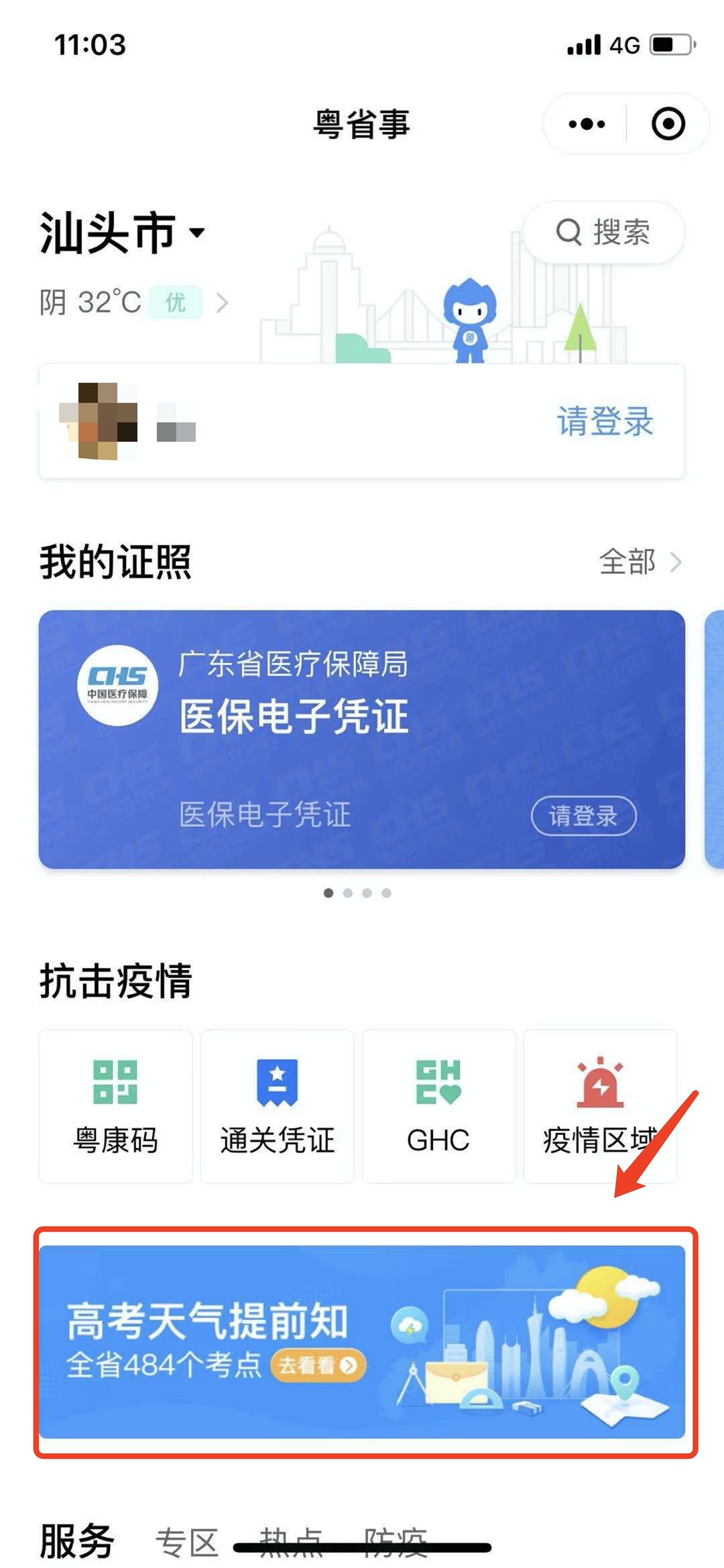 ②进入“粤省事”小程序,首页点击“高考天气提前知 全省484个考点”。