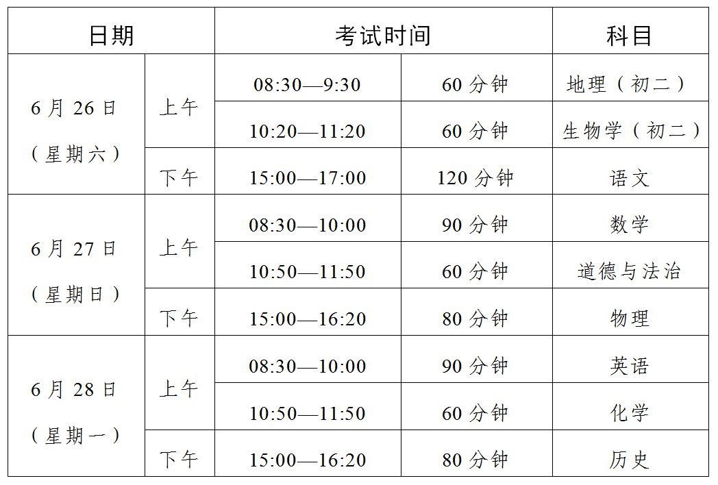 根据《广东省教育厅关于印发初中学业水平考试实施办法的通知》(粤教考〔2018〕12号)的要求,在充分征求各地市意见的基础上,经研究,现将2021年委托省命题地市的初中学业水平语文、数学、英语、道德与法治、历史、地理、物理、化学和生物学等科目考试时间安排如下:
