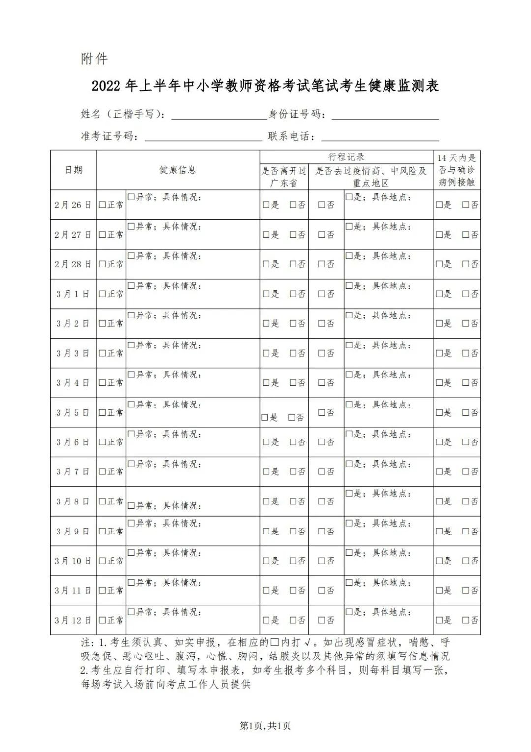 二、所有考生须从2月26日起做好每日体温测量、记录并进行健康状况监测(监测表见附件,请自行下载打印),每天如实填写监测表,如考生报考多个科目,则每科目填写一张,考试当天在每场考试入场前提交至考点工作人员。身体出现异常情况的,要及时报告当地教育行政部门,经相关部门研判,具备条件方可参加考试。