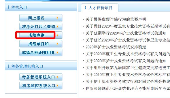 第一步:进入中国卫生人才网,点击『成绩查询』